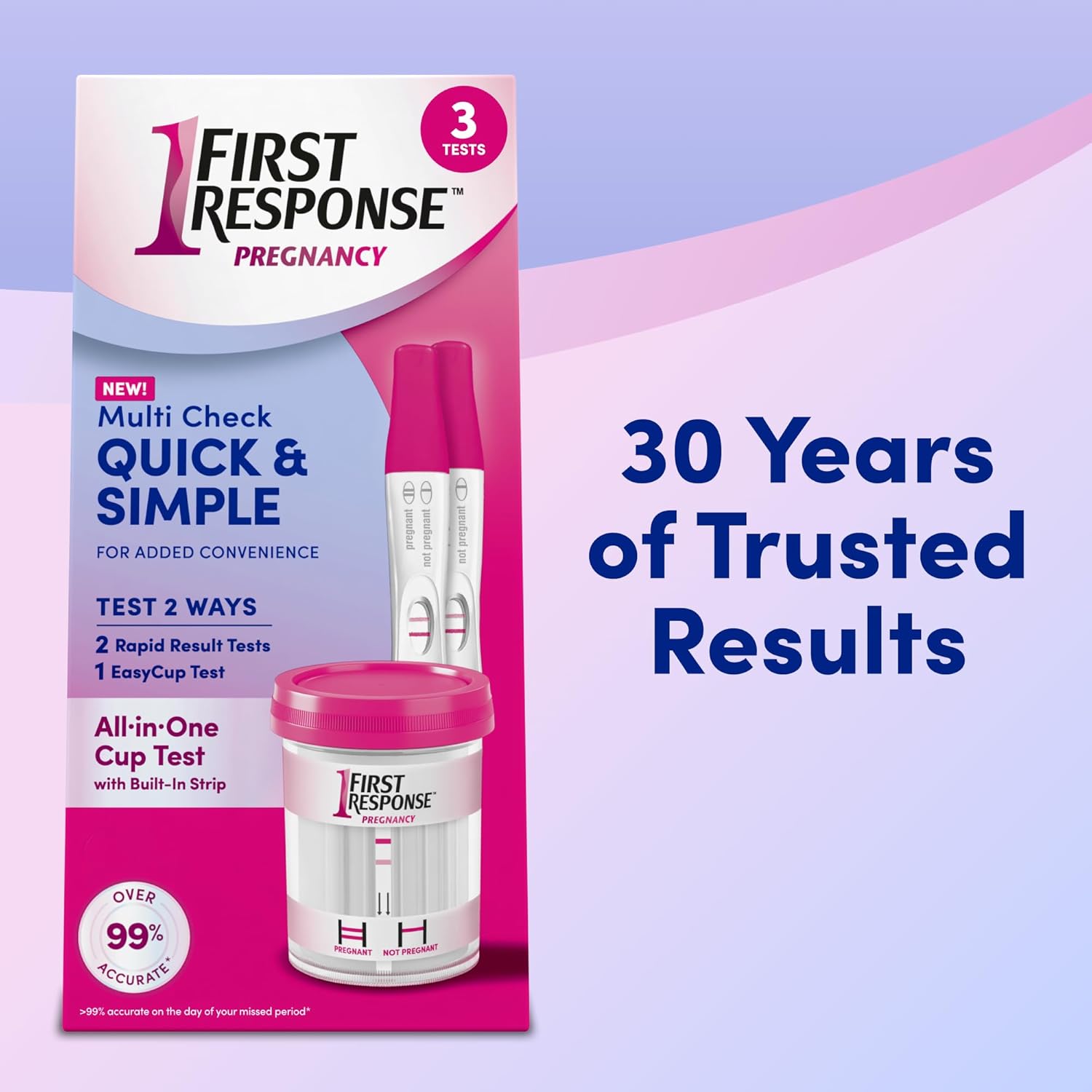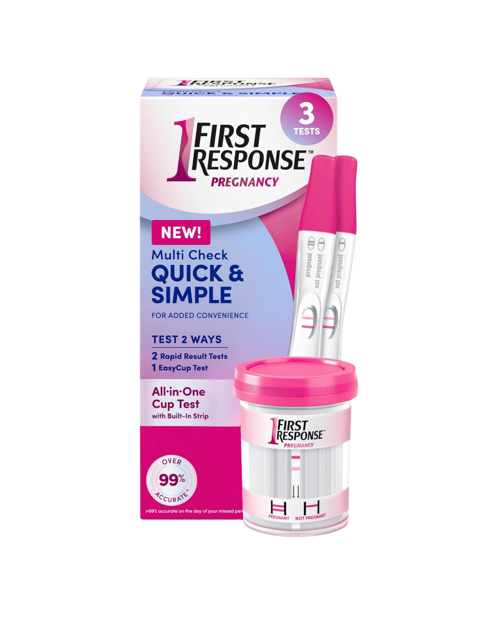 The FIRST RESPONSE™ Multi Check Pregnancy Test Kit offers two simple ways to check for pregnancy, giving you convenience, reassurance, and confidence in one pack. This kit includes three tests: